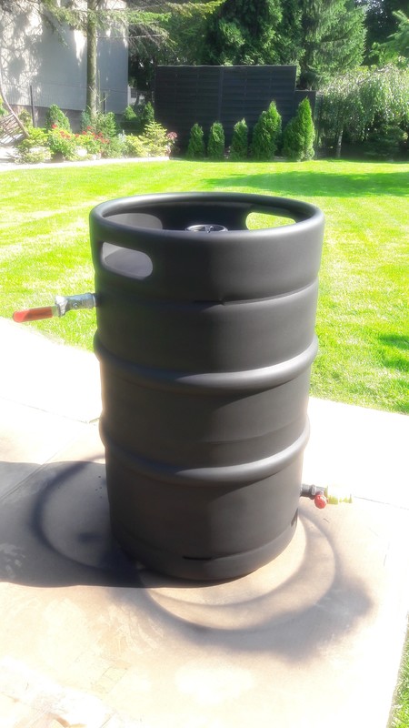 2. Chciałbym zapytać bardziej doświadczonych kolegów w temacie możliwości podgrzania wody w okresie letnim przy pomocy butli KEG. Butla ma pojemność 50 litrów wykonana jest ze stali 1.4571. Zamysłem jest aby butla podgrzewała wodę wstępnie dla 1-2 osób. Do butli zostały wspawane tig-em 2 króćce do których mają być podłączone zasilanie i odbiór. Na zasilaniu zbiornika (zimna woda) został dodatkowo umieszczony zawór bezpieczeństwa 6 bar. Zbiornik KEG pomalowany na czarno farbą żaroodporną. Zamysł jest taki aby ten zbiornik umieścić za szybą ( czyt. skrzynka szklana z tylną i dolną ścianą ocieploną. Pytanie czy takie rozwiązanie będzie bezpieczne do podpięcia do sieci. Jak widać na zdjęciach wszystko robione ze "złomu" który walał się po domu tw. obecnie koszt wykonania to 15 zł za farbę . Moje pytanie jest następujące czy samo ciśnienie sieci wodociągowej i zawór bezpieczeństwa 6 bar są wystarczającym zabezpieczeniem przed efektowym wywaleniem całości w powietrze w ciepły dzień ?? ( czyt. czy bez zbiornika przeponowego ani rusz ??) Dodam, że woda będzie stale pobierana i upuszczana w tym miejscu gdzie planuję instalację (codzienne użytkowanie). Gdyby w okresie letnim uzyskać z tego patentu 50 litrów wody o temperaturze 35-40 C spełniło by to moje wymagania. (np. darmowe zasilanie pralki) Dodam tylko, że zbiornik jest czysty nie zawiera zanieczyszczeń wykonanie nierdzewne. Pomysł może chory ale zrodził się czytając wpisy typu : "zamiast solara lepiej postaw czarną beczkę i więcej wody nagrzejesz... "