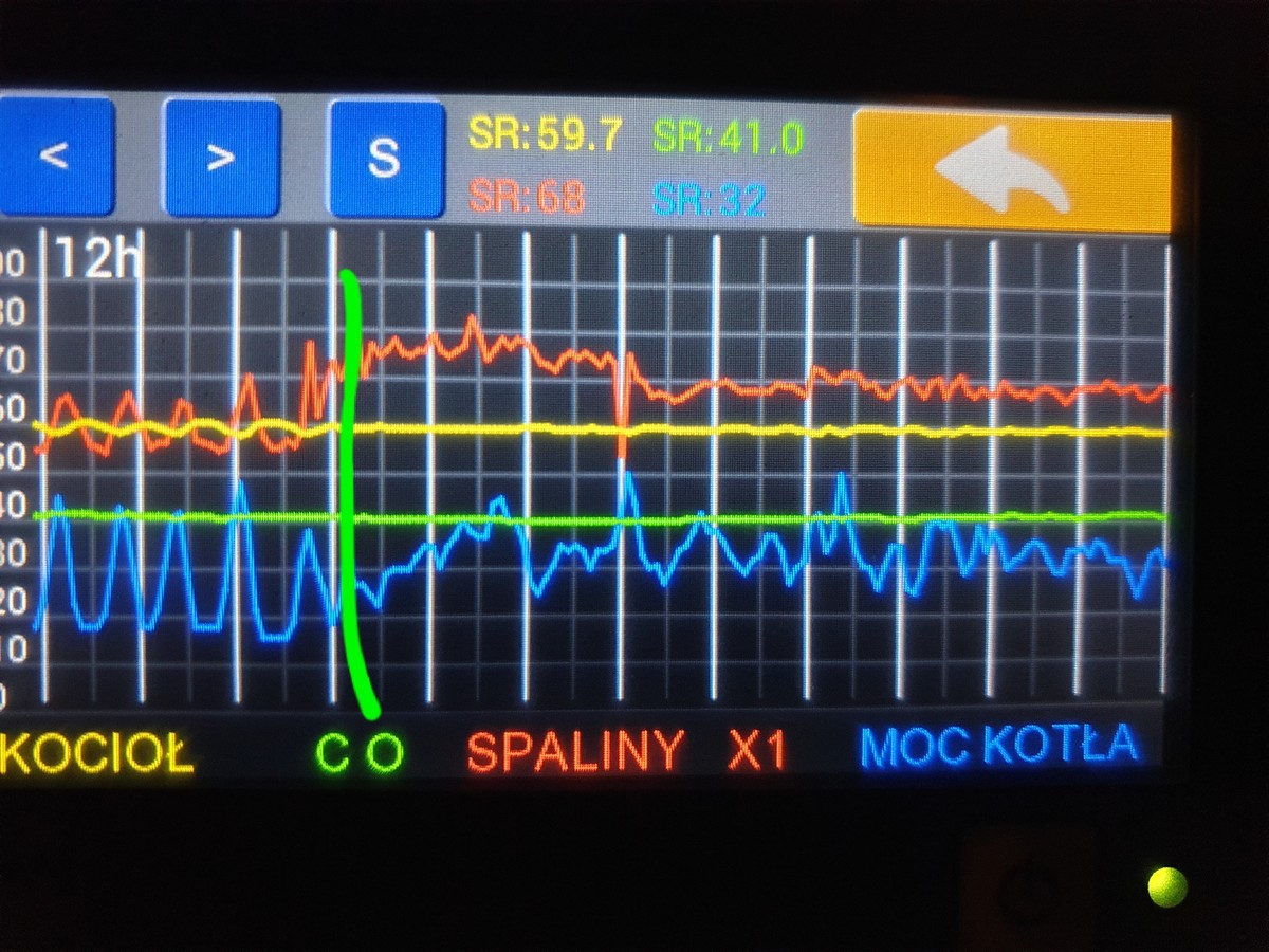 Kurde oglądając na forum i na fb wykresy sv200 i skzp cos mi nie pasowało w moim kotle. Za bardzo szarpał mocą przy modulacji na 1, spaliny niskie bo 50-70°C, tlen na bragerze nawet ok a w kotle sadza. I znalazłem dzisiaj winowajce. Brak silikonu na odcinku 3-4cm przy połączeniu czopucha przykręcanego do kotla. Zielona kreska to moment uszczelnienia. Kocioł cały czas pracował. A tu zdjęcie z teraz jak się ustabilizowało wszystko. -