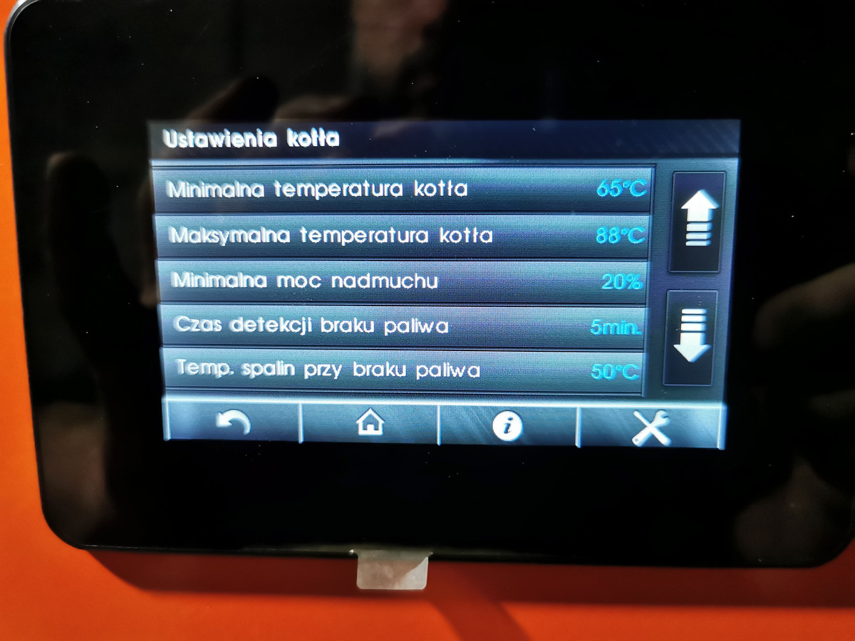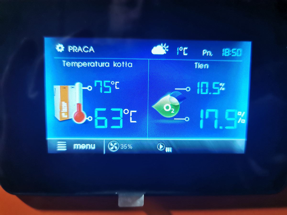 Grzebię trochę w ustawieniach i testuję. Mam parę pytań. Mianowicie mam ustawioną temp. kotła na 75 stopni ale widzę, że kocioł dogrzewa się średnio do 55-58 stopni. Moje obecne ustawienia to H kotła 20, H2-22, H1-20. 100%- 60%,4s,7s,8,5% 50%-45%,4s,20s,10,5% 30%-30%,4s,50s,12,5% Posiadam sondę lambda. Piec pracuje w modulacji 50/30 i praktycznie nie wchodzi na 100%. Temperatura spalin 50% 100-120st. 30% 85-100st. tlen 50%-10,5%, 30%-12,5%. Mam ustawione sterowanie pogodowe tak, że na mieszaczu jest 50st. ale rzadko dobija do tej temp. przeważnie 47-49st. Praca wg. harmonogramu z obniżeniem 3st. Spalanie za ostatnią dobę temp ok.-3,-4 w nocy i -1, -2 w dzień równe 2 worki. Nie mam miarkownika ciągu kominowego ani termostatu pokojowego. Jak to według was wygląda?