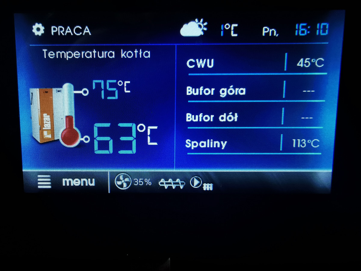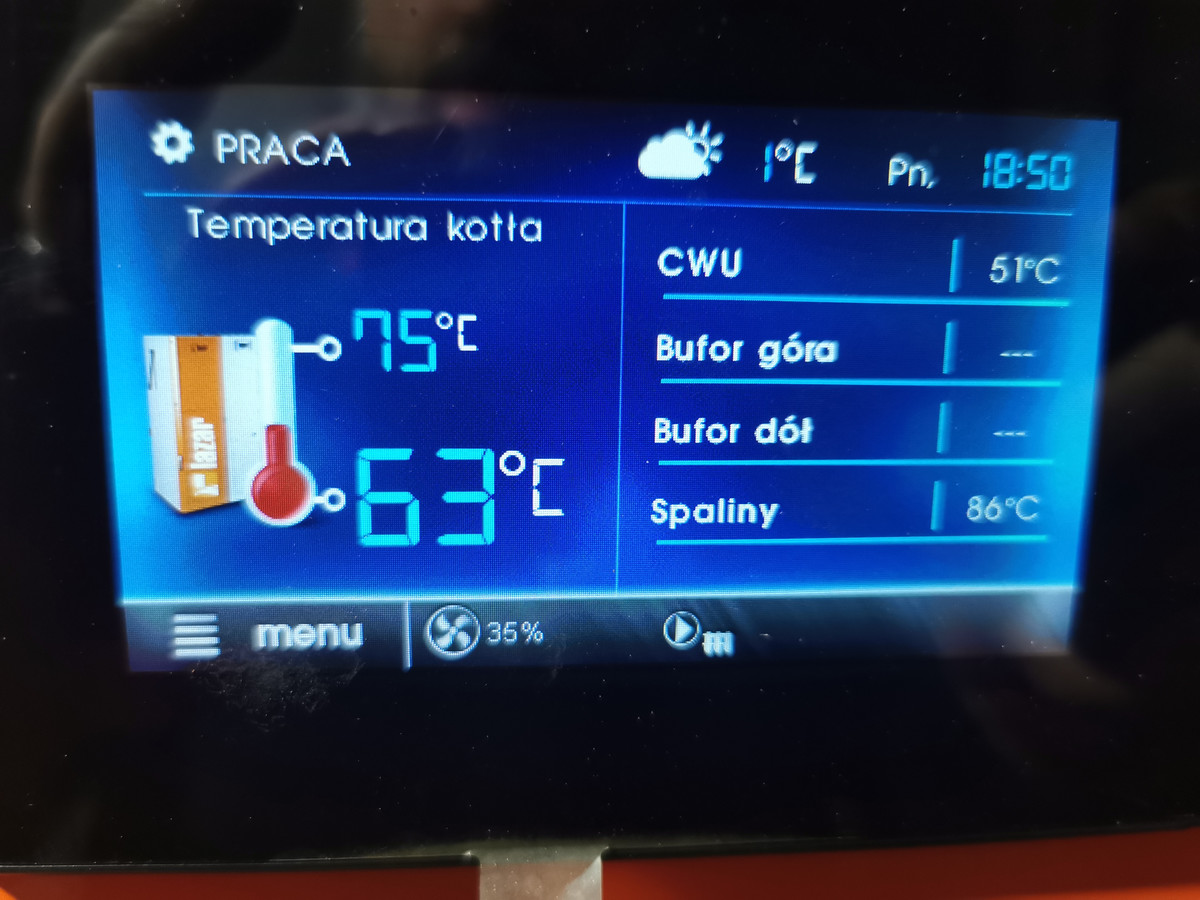 Założyłem smartflow na komin i dałem minimalne obroty wentylatora 17%, sonda tak koryguje po swojemu ale widzę, że głównie wentylator pracuje na 17-20%. Poprawił się tlen i jest prawie na równi z zadanym. Spaliny spadły z ponad100 st. na 65-75 stopni. Co myślicie o tym? Acha jeszcze jedno. Czy nie jest tak, że jeżeli mamy ustawione sterowanie pogodowe to kocioł sam reguluje swoją temperaturę i dla tego pomimo ustawienia temp. na kotle 75 st. podbija tylko do 55-60st. bo tyle potrzebuje? To jest w punkcie 8.3 instrukcji. 8.3 Ustawianie temperatury zadanej kotła Temperaturę zadaną kotła, podobnie jak temperaturę zadaną obiegów mieszacza można ustawić z poziomu menu (możliwe do ustawienia wartości tych temperatur są ograniczone zakresem odpowiadających im parametrów serwisowych regulatora). Ustawienia kotła > Temperatura zadana kotła Ustawienia mieszacza 1 >Temp. zadana mieszacza Ustawienia mieszacza 2 >Temp. zadana mieszacza Ustawienia mieszacza 3 >Temp. zadana mieszacza Ustawienia mieszacza 4 >Temp. zadana mieszacza Ustawiona w pozycji Temperatura zadana kotła temperatura, jest przez regulator pomijana w przypadku, gdy temperatura zadana kotła jest kontrolowana czujnikiem pogodowym. Niezależnie od tego, temperatura zadana na kotle jest automatycznie podnoszona, by móc załadować zasobnik ciepłej wody użytkowej oraz zasilić obiegi grzewcze mieszaczy.