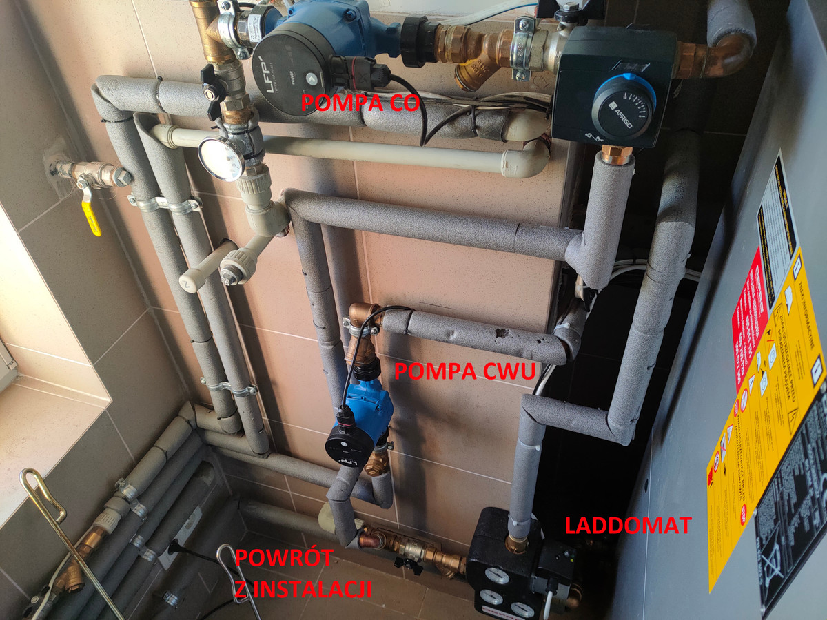 5. Cześć. Mam problem z niedogrzanym powrotem w kotle na pelet Defro 10 KW. Poprosiłem o pomoc instalatora, który zaproponował zamontowanie laddomatu, jako urządzenie które świetnie wygrzewa kocioł i powrot. Został założony zgodnie ze zdjęciem w załączniku. Zasilanie z kotła idzie bezpośrednio na zawór 3d, pompę CWu oraz laddomat. Od tego czasu, w instalacji słychać dziwne dźwięki m.in przelewanie wody, pompki potrafią się przycinać i zgrzytać, a sam kocioł dłużej się nagrzewa. Co jest nie tak ?