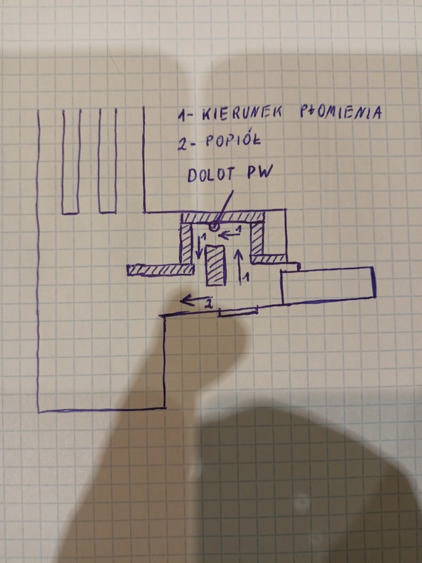 Jak bym w miejscu palnika podszedł tunelem pod sam wymiennik, to mam tam wloty powietrza wtórnego które mógł bym wykorzystać. Będzie tylko problem z czyszczeniem komory spalania, nie wiem czy da radę zrobić taką konstrukcję bez klejenia.