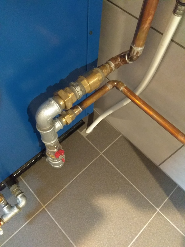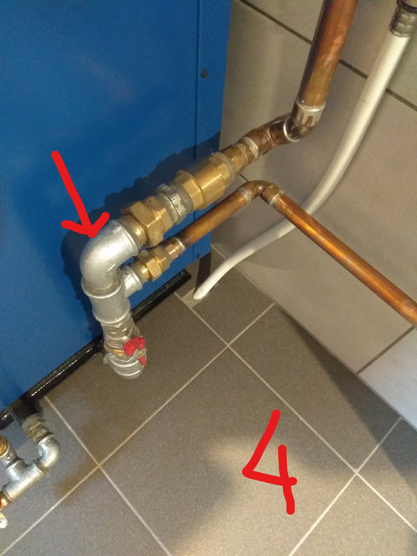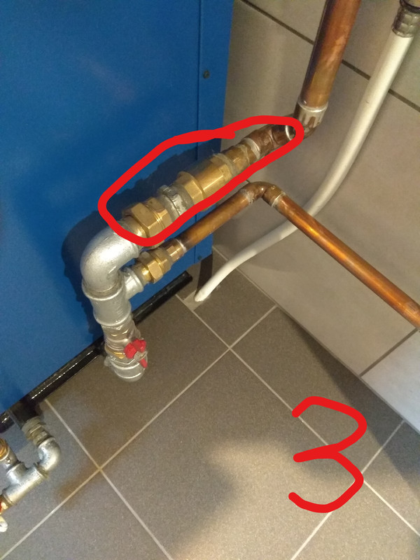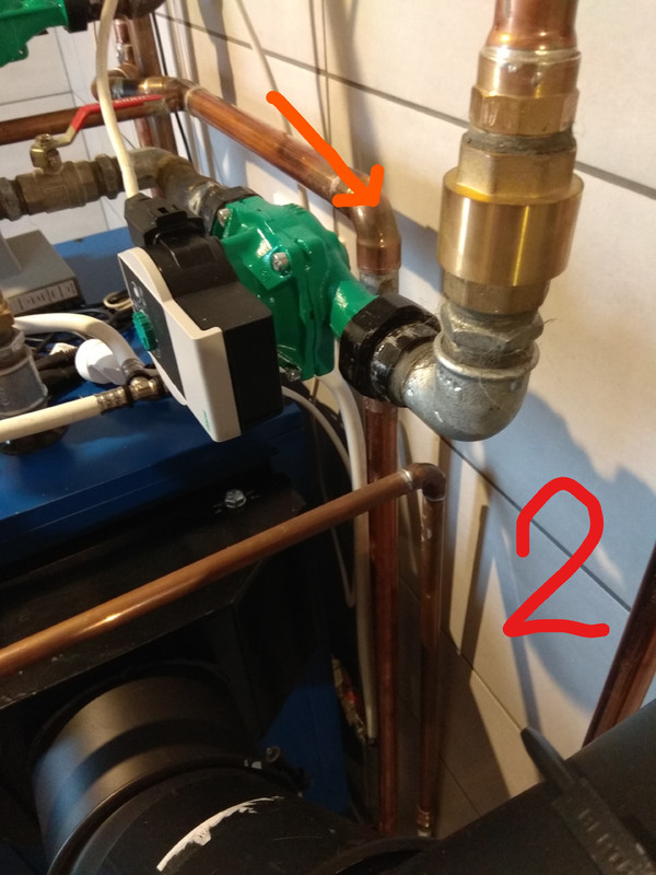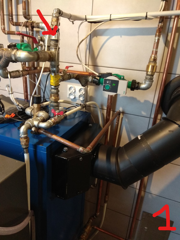 Na zdjęciu nr 1 pokazałem miejsce, gdzie chciałbym wstawić trójnik, filtr oraz pompę kotłową. (tam jest główne wyjście z pieca). Widoczna na górze wyjścia z pieca rura pex biegnąca do góry prowadzi do grupy bezpieczeństwa.