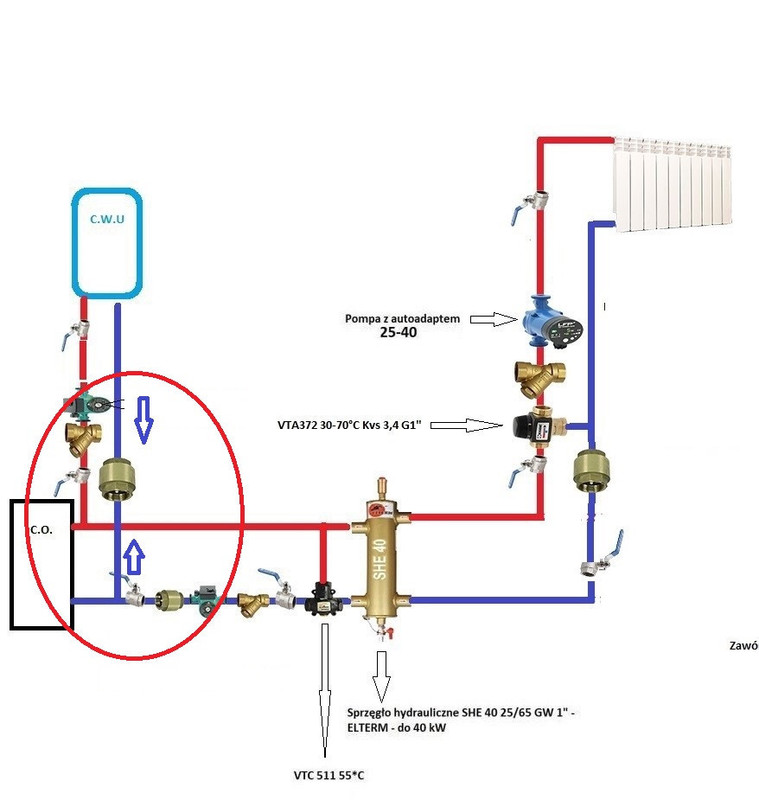 Witam, skończyłem budować swoją kotłownię i mam problem z obiegiem między piecem a sprzęgłem. Mianowicie pompka się włącza, rury od zasilania ciepłe a od powrotu zimne. Ciepła woda nie dochodzi nawet do sprzęgła. Czy jest możliwe że to przez tez zawór temperaturowy zaznaczony na zdjęciu? Za daleko od pieca czy coś? Ewentualnie układ ciągle zapowietrzony?