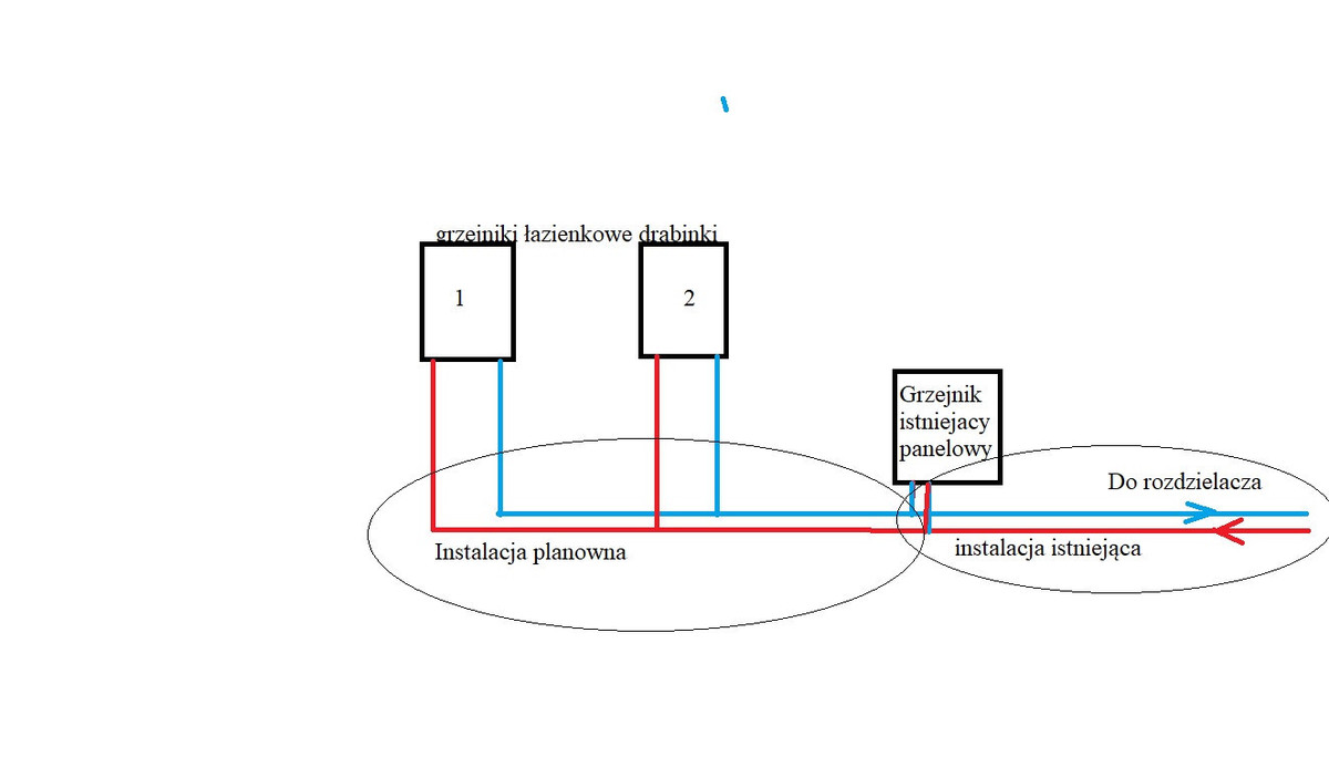 Dzien Dobry Prosiłbym o wydanie opinii na temat modyfikacji instalacji CO Mam instalację z kotłem z podajnikiem, rozdzielacze na parterze i piętrze, zasilanie rozdzielaczy rura stalowa 1", rozprowadzenie na grzejniki pex 16x2mm. Pompa alfa2 40. Po czasie wyszła konieczność ogrzania łazienek w pokojach na pietrze, dzieci dorastają, chcą pokoje jak najdalej od rodziców. Jak robiłem ogrzewanie koncepcja była inna, teraz się pozmieniało. Chciałbym zainstalować dwie niewielkie drabinki w łazienkach obok siebie - przez ścianę. Problem w tym, że żeby dociągnąć zasilanie z rozdzielacza,to do kucia cała podłoga na korytarzu z płytkami włącznie. Raczej odpada. I tu jest pytanie? Opcją byłoby założenie trójników przy najbliższym grzejniku na korytarzu, tu byłby tylko 1m płytek od odcięcia i skucia. Tylko przekrój rurek do kaloryfera raczej mizerny i czy to będzie grzało? W załączniku schemat poglądowy. Odległość grzejników łazienkowych od siebie to ca.1m, od grzejnika na korytarzu ca.2m i z 1m w górę. Prosiłbym o opinie. Pozdrawiam i dziękuję