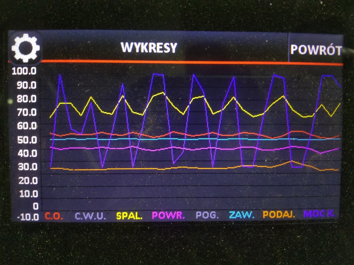 Muszę się pochwalić jaki efekt przyniósł montaż pompy na powrocie, oraz przede wszystkim nowy soft sterownika uzyskany od kolegi Kijasr (jeszcze raz dziękuję). Oto wykres z ostatnich 6 godzin pracy kotła, oraz podgląd na temperatury. Ustawienia wbite wczoraj na szybko, możliwe że jeszcze będą korygowane Dla porównania, wykres sprzed zmian -