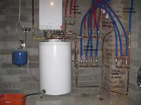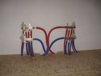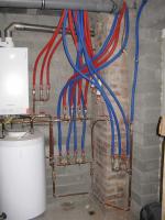 3. Witam po przerwie. Dla uzupełnienia tematu załączam zdjęcia z wykonanej instalacji. Zrobiłem ją już w listopadzie ale dopiero teraz mam trochę czasu aby pokazać. W czasie wykonywania zrobiłem kilka zmian: 1. Zmieniłem średnice rur CO pomiędzy głównym rozdzielaczem a rozdzielaczami na piętrach z 25mm na 20mm. Facet w sklepie twierdził do zasilenia 4 grzejników na rozdzielaczu wystarczy średnica 20mm, no i mnie przekonał. 2. Aby nie zrobić zbyt dużego tłumienia zaraz za kotłem, główny rozdzielacz wylutowałem z kształtek miedzianych. Wyjście z kotła 28mm potem trójniki 28-20-28. Wszystkie zawory zamiast przy rozdzielaczach na piętrach są w kotłowni. Powinno ułatwić okresowe zamknięcie o otwarcie zaworów tak aby się nie zastały. 3. Przy wykonywaniu ciepłej i zimnej wody darowałem sobie rozdzielacze. Główne rury poprowadziłem średnicą 20mm i odejścia do kranów 16mm. Zamiast dwóch obwodów zrobiłem trzy (na piętrze są rozbite na 2 odrębne) 4. Przygotowałem orurowanie do cyrkulacji ale z uwagi na brak funduszy nie zamontowałem jeszcze pompy. W sumie to jeszcze nie wiem jak rozwiązać problem trzech obiegów i jednej pompy ;-)