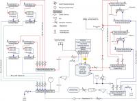 9. Sawo, dzięki za komentarz. Przeliczyłem objętości płynów: - w grzejnikach będzie ok 97 l - w pionach ok 19 l - w przewodach rozprowadzajacych 30 l. W sumie daje to 146 l. Jest na styk więc dodałem naczynie przeponowe do obiegu grzewczego, plus odpowietrzniki do rozdzielaczy. Pozatym, zgodnie z twoimi sugestiami zmieniłem układ ciepłej wody. Dodałem również cyrkulację choć nie jestem przekonany do jej stosowania i pewnie jej nie wykonam. Załczam poprawiony schemat.