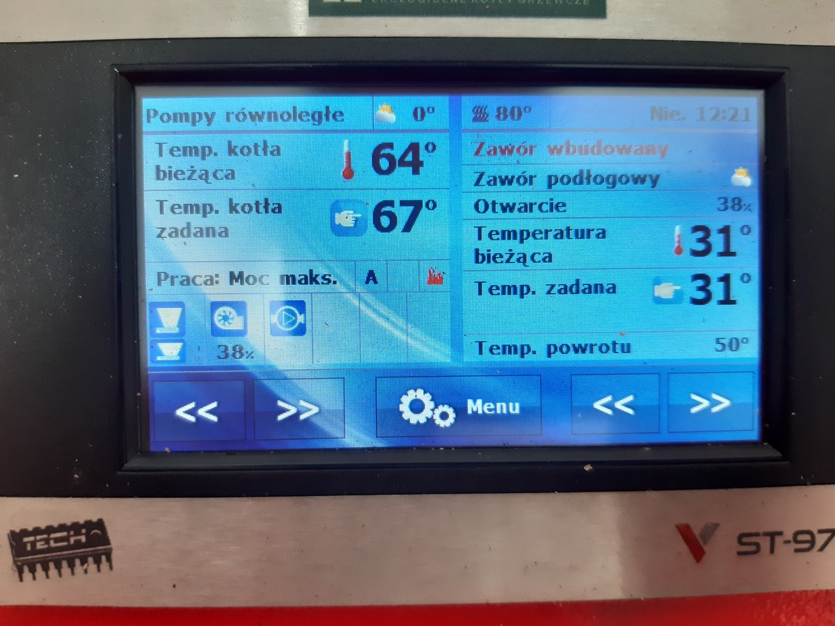 Kocioł to Logiterm EkoPellet 16 kW z palnikiem Venma 16kw i sterownikiem ST-976. Doprowadzenie powietrza do kotlowni jest. Zawor 4d sterowany pogodowka, teraz na podłogę idzie 31 st. Powrot bez pompy kotłowej, grawitacyjnie przez zawor 4d, 15 stopni mniej niż na wyjściu. Spalanie ok 20kg na dobę.
