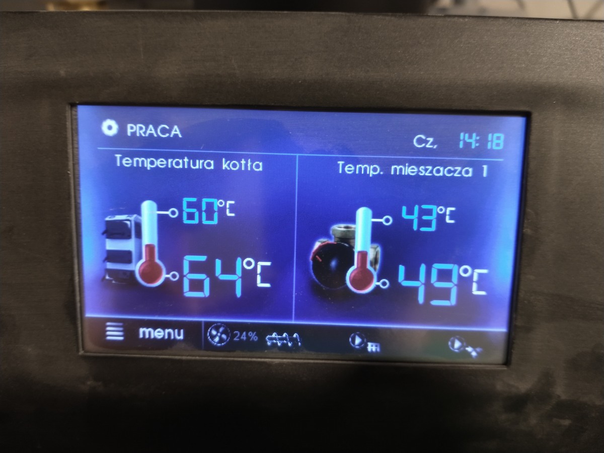 Mam panel pokojowy. Na grzejnikach jeszcze nie ma termostatów, ale większość z nich jest zakręcona, bo na poddaszu było tak gorąco, że nie dało się robić wykończeniówki. Zużycie paliwa było około 2 worki na dobę teraz (po skręceniu grzejników) mniej. Samymi grzejnikami i panelem pokojowym, bez grzebania w sterowniku, udało mi się ustawić piec tak, że przy aktualnej pogodzie są 2 rozpalenia na dobę. Wcześniej zdarzyła się doba z 20 rozpaleniami... Za czujnik temperatury spalin jak na razie robi moja ręka przyłożona do czopucha. Na mocy minimalnej mogę położyć na nim rękę i trzymać tak długo jak chcę. Na maksymalnej dotknę, ale nie utrzymam ręki na czopuchu. Kilka godzin temu zwiększyłem nadmuch i wyczyściłem szamot. Nic to nie dało, znowu jest zawalony czarnym pyłem. I chyba przybyło niespalonych drobinek pelletu wywianych z palnika. Może to wina pelletu? Mam import z Białorusi. -