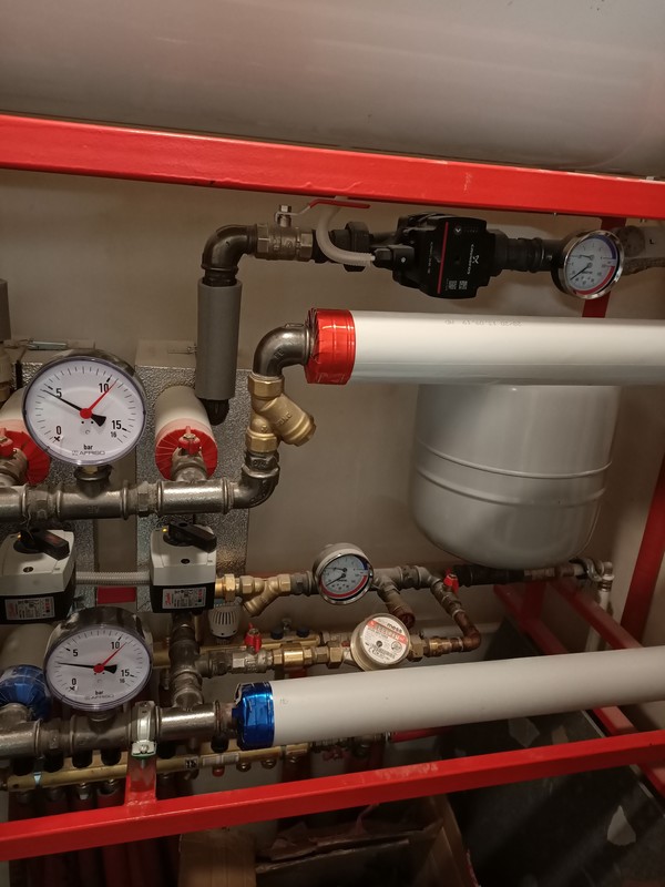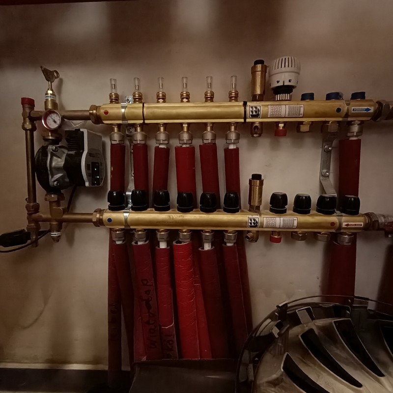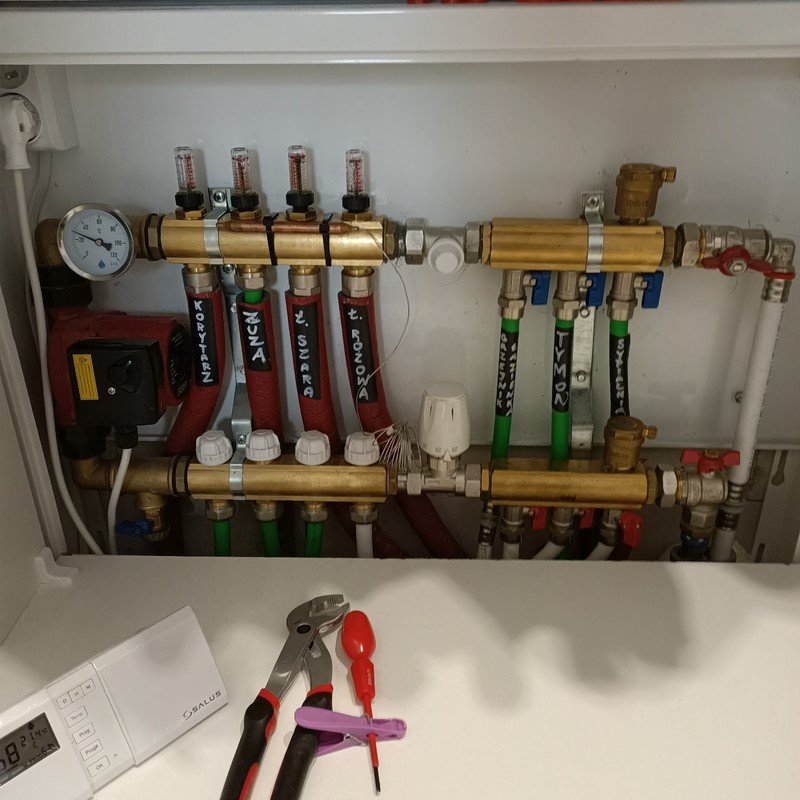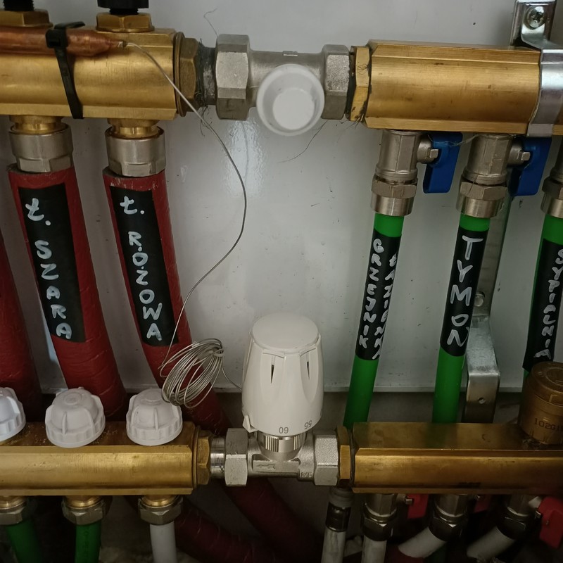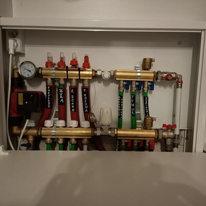 1. Witam, Proszę o sprawdzenie czy instalacja na załączonym zdjęciu jest prawidłowa. W grudniu przy okazji remontu zamontowano mi taki rozdzielacz z grupą pompową, tak aby w podłogę szła niższa temperatura, a w grzejniki wyższa. Problem polega na tym, że wg termometru na rozdzielaczu temperatura zasilania podłogi to 40 stopni. Nie mogę skrecić temperatury w dół, mogę jedynie podwyższyć. Wydaje mi się, że wcześniej temperatura ustawiona była na 34 stopnie. Regulowałem przepływy i zorientowałem się że temperatura wynosi 40 stopni. Zdemontowałem głowicę termostatyczną i ponownie założyłem ale nic to nie zmienia. Minimalna temperatura to 40 stopni. Czy coś mogło się zaciąć/uszkodzić w głowicy czy jest to wina błędnego wykonania instalacji - kolega stwierdził, że brak jest zaworu trójdrożnego i nie będę mógł regulować temperatury zasilania - a jedynie przepływ wody. A może coś należy przestawić w tej głowicy? Nie znam się kompletnie - proszę o pomoc.