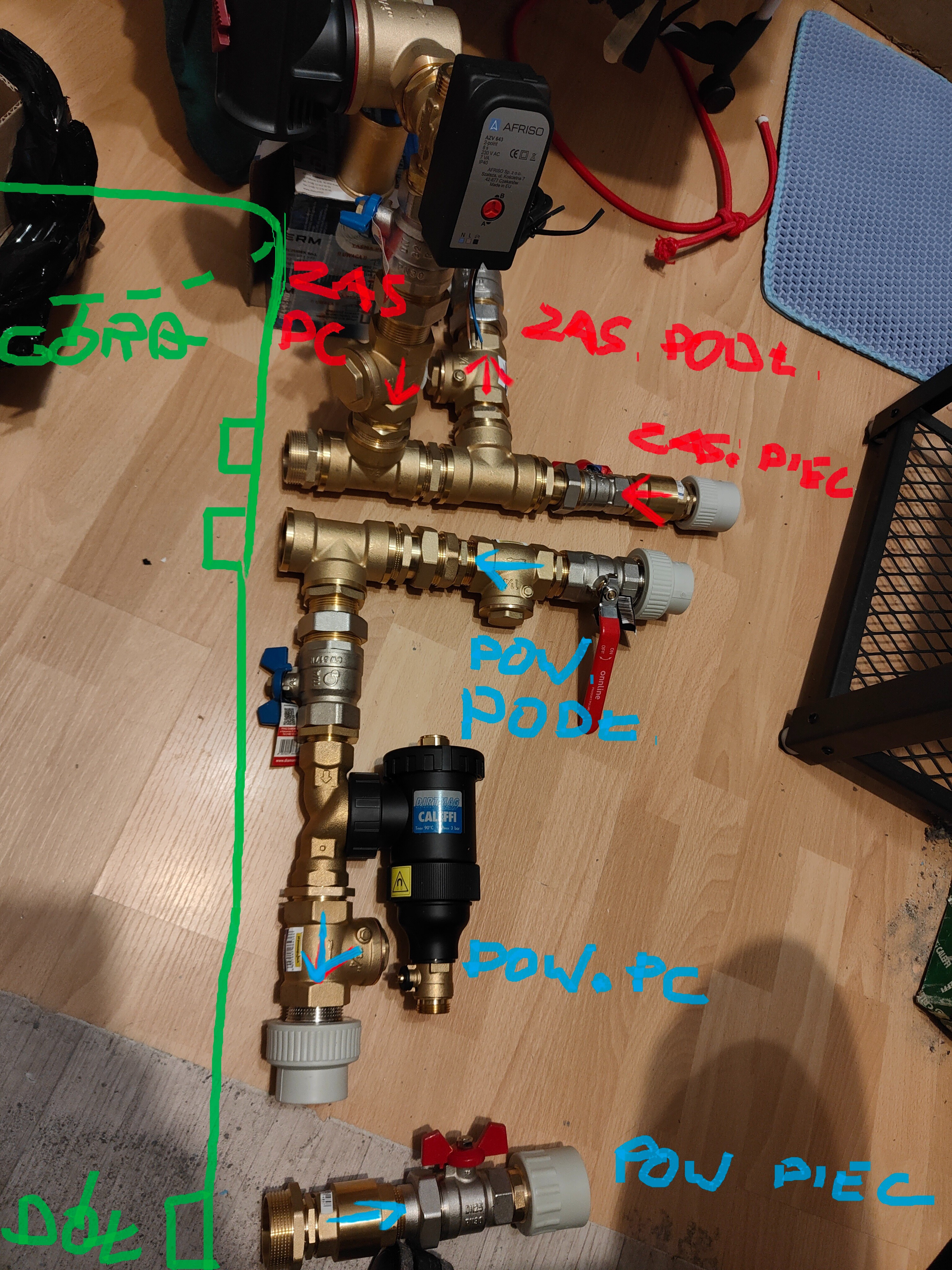 Podłączenie zasilania podłogówki + zasilanie bufora z PC oraz z pieca stałopalnego do jednego króćca w buforze