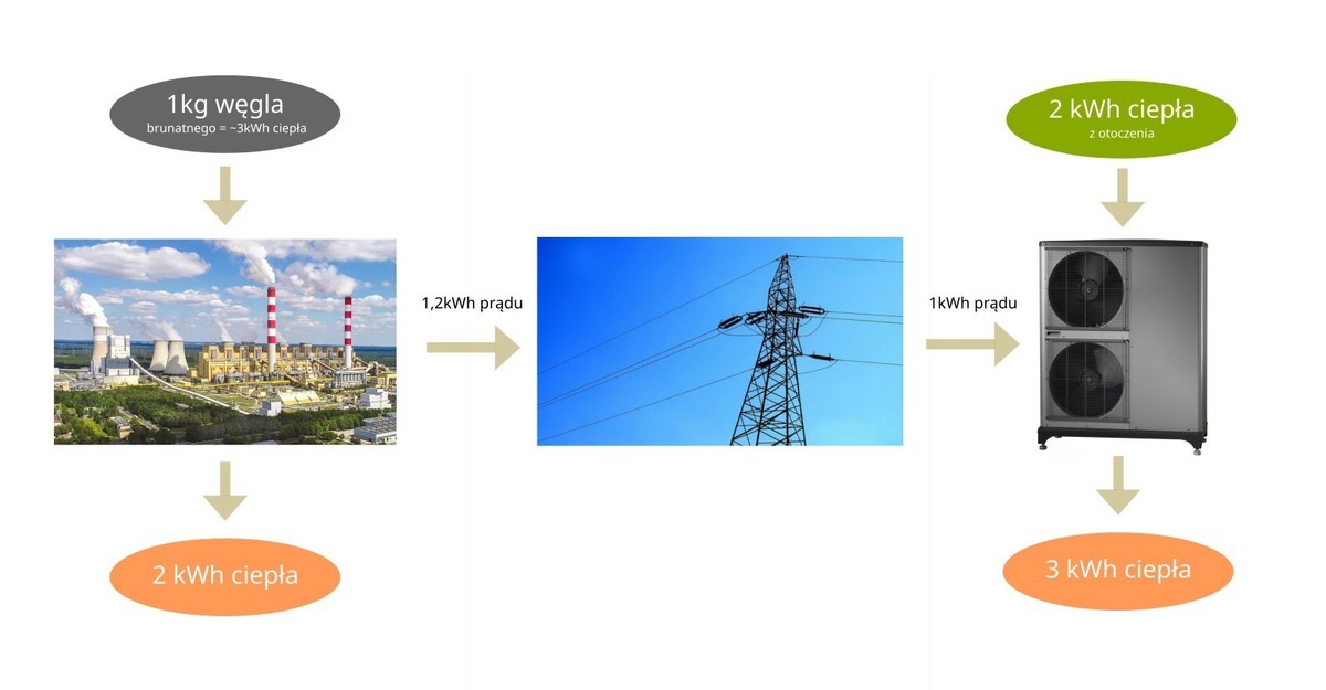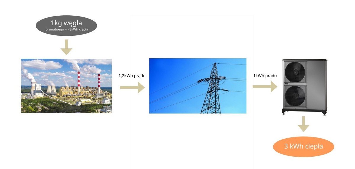 Kiedyś też tak myślałem: z 3kWh energii w wonglu pompa ciepła robi 3kWh energii cieplnej w chaupie. Ale jak się przyjrzeć ogółem to inaczej to wygląda: z 3kWh energii w wonglu uzyskuje się w sumie min. 5kWh, czyli prawie dwa razy tyle. Zatem na uzyskanie takiej samej ilości ciepła spala się mniej wongla niż gdyby go smażyć w domach.