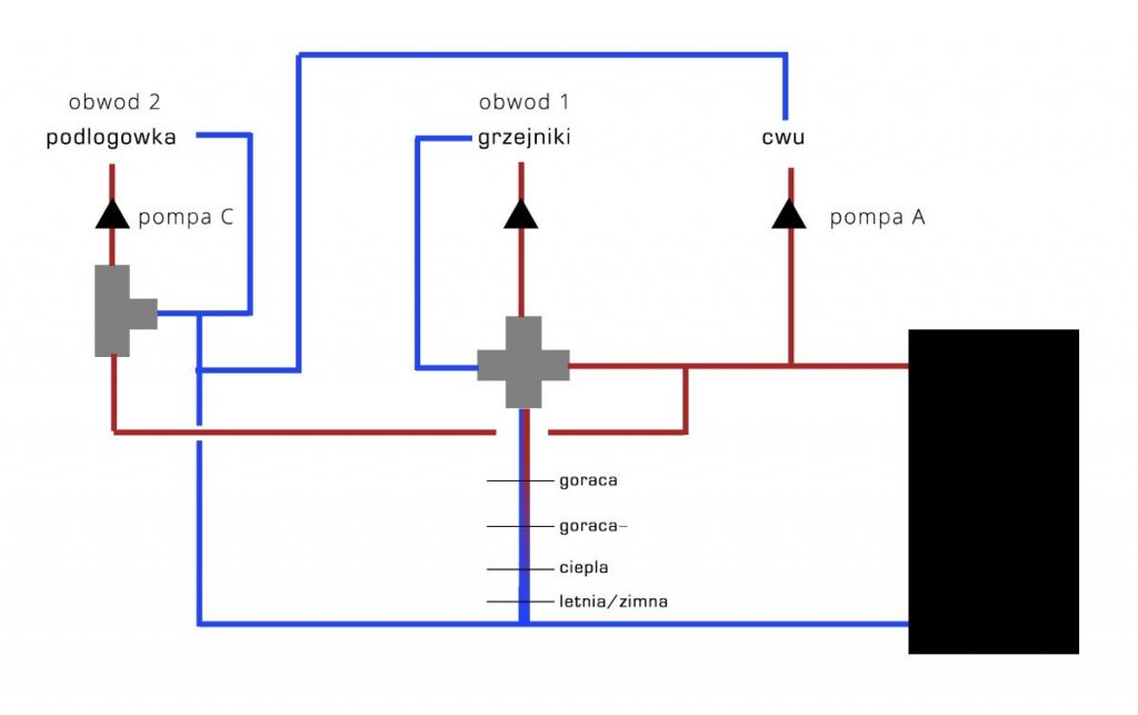 To chyba tylko w teorii 4D powinien tak działać, u mnie to nie funkcjonuje zupełnie. Na powrocie mam 30 stopni non stop, jedynie kiedy ładuje CWU robi się 40-48. U mnie tak to mniej więcej wygląda (na szybko, bez naczynia itp): W momencie wyłączenia grzejników gdzie cała ciepła woda powinna wracać w dół w obieg kotła sytuacja jest taka jak na obrazku - im niżej i bliżej miejsca gdzie gorąca woda z 4D powinna łączyć się z chłodniejszą wodą wracająca z podłogi robi się zupełnie zimna rura :( Co do Twojego termometra to masz faktycznie ale analogowy tylko do Twojej informacji, piec o tym termometrze nie wie ;) Tak jak koledzy mówili musiałbyś dołożyć moduł + sonda. -